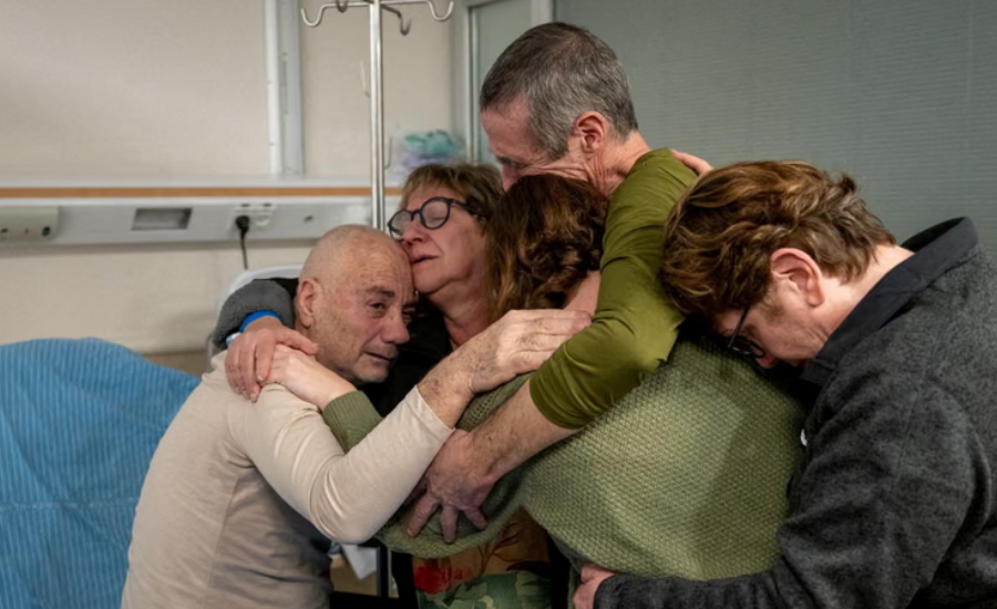 Louis Har, left, and Fernando Simon Marman, second from right, were met at Sheba medical centre by their family after being rescued in an overnight Israeli raid on Rafah. Photo Credit: Israel Defense Forces/Reuters
